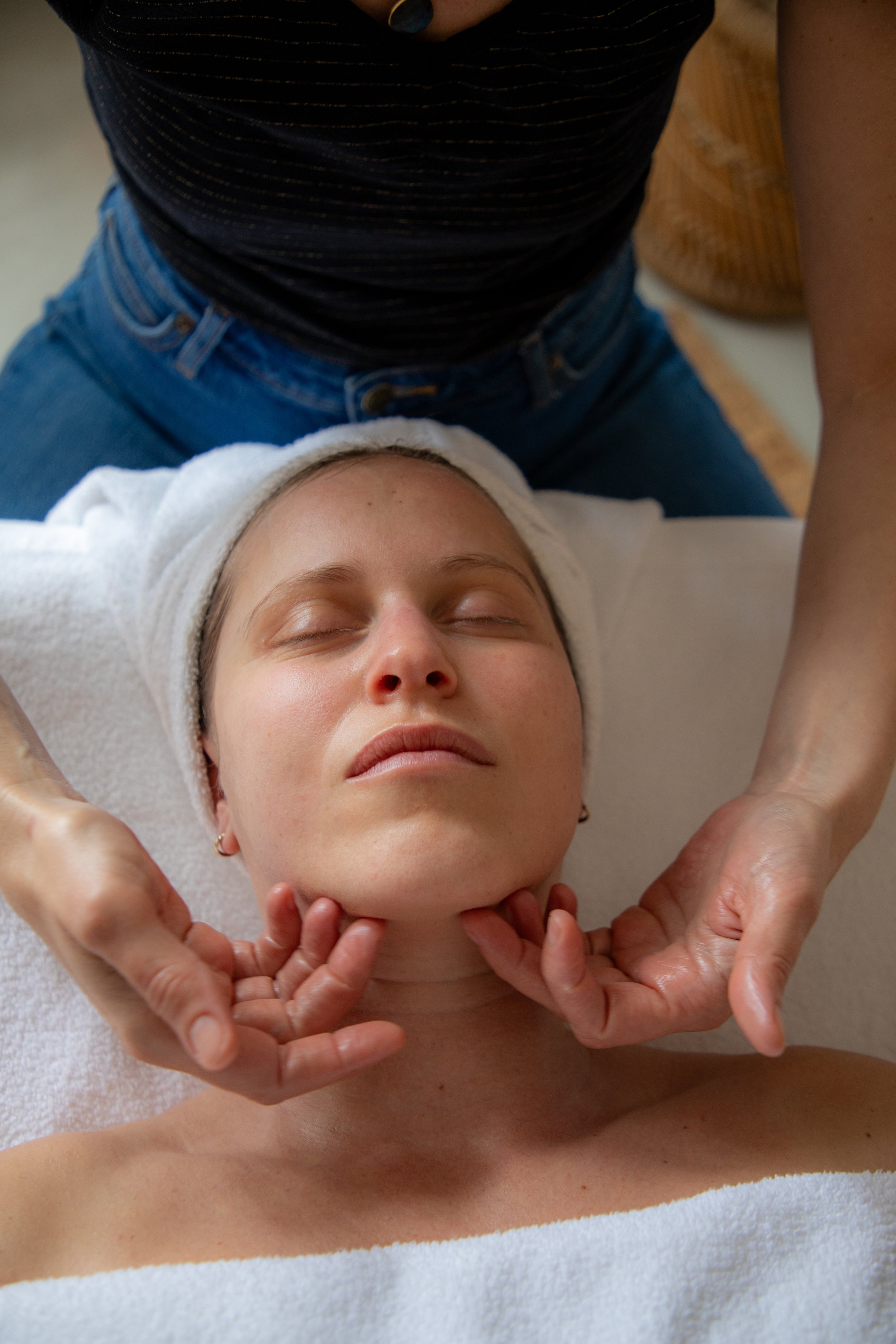 Avant les outils, il y a les mains. Le drainage lymphatique facial repose sur des manœuvres directionnelles précises, adaptées aux trajets physiologiques des collecteurs lymphatiques. Pression, rythme, direction — chaque geste a une logique anatomique. C'est cette compréhension qui transforme un soin en résultat visible.